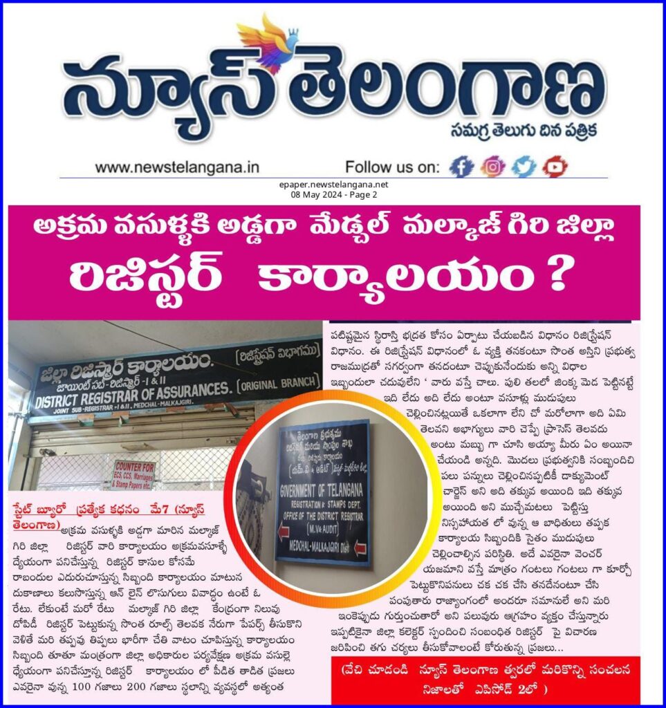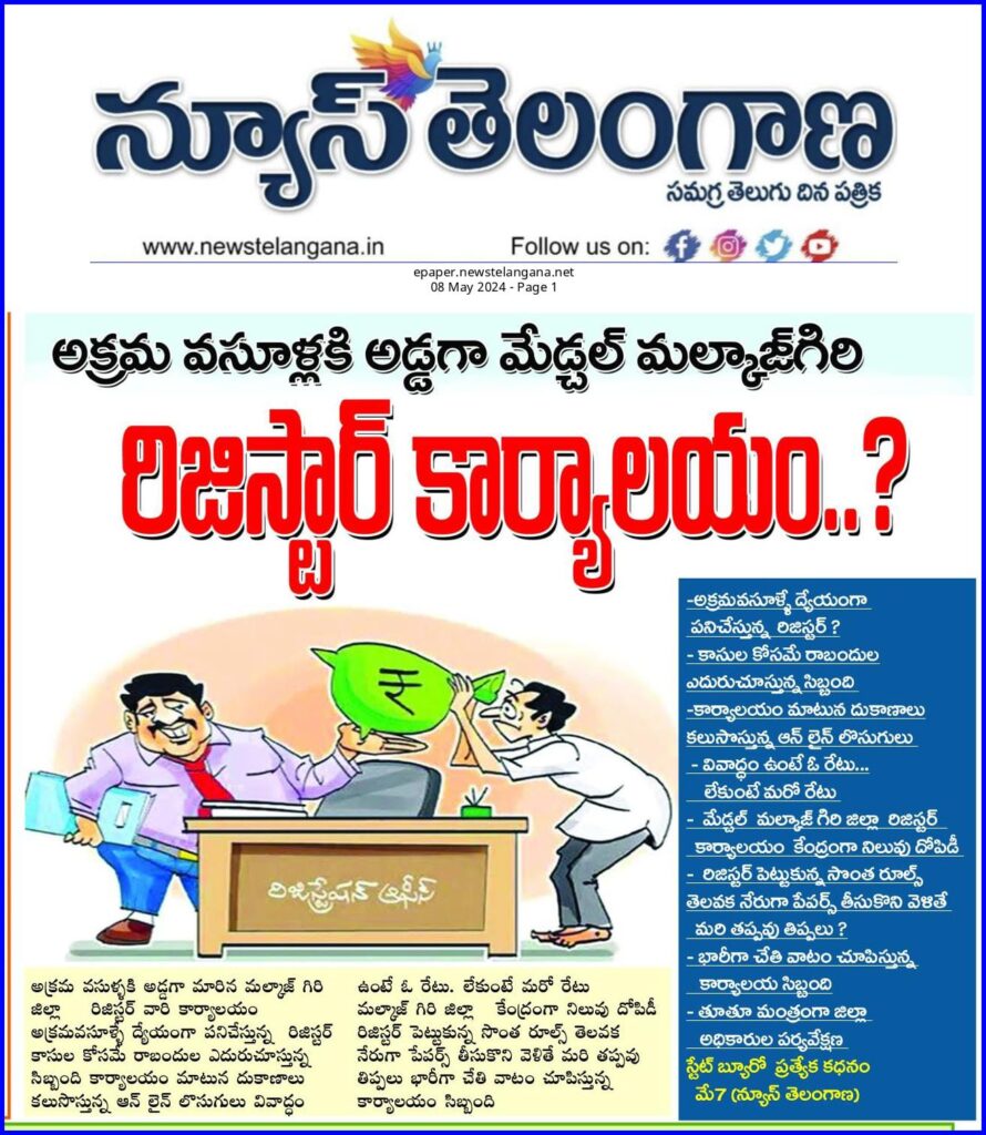 - రియల్ ఎస్టేట్ రంగాన్ని అదునుగా చేసుకుని కోట్లు గట్టిస్తున్న మేడ్చల్ మల్కాజ్ గిరి జిల్లా రిజిస్టర్