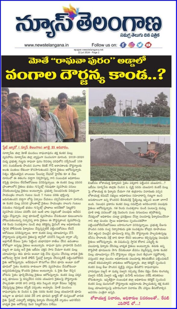 సూర్యాపేట జిల్లా మోతే మండలం రాఘవాపురం గ్రామ రెవిన్యూ లోని సర్వేనెంబర్ 159 161 లో 2019 2020 సంవత్సరంలో ప్రభుత్వ పొందిన వంగాల కిరణ్ గౌడ్ రైతులకు తీవ్రంగా నష్టం కలిగిస్తూ ఇష్టానుసారంగా బ్లాస్టింగ్లకు పాల్పడుతున్న వైనంపై న్యూస్ తెలంగాణ సంచలన కథనాన్ని ప్రచురించిన సంగతి తెలిసిందే. న్యూస్ తెలంగాణ వార్త కథనం సూర్యాపేట జిల్లాలో పెను సంచలన్ని సృష్టించింది. ప్రభుత్వానిబంధనలను పట్టించుకోకుండా ఇష్టానుసారంగా వ్యవహరిస్తున్న తీరుపై రైతుల ఆరోపణ మేరకు న్యూస్ తెలంగాణ పలు విషయాలను సేకరించింది. సాయంత్రం నాలుగు గంటల నుండి 7 గంటల వరకు బ్లాస్టింగ్లకు పాల్పడుతూ రైతుల వ్యవసాయం పనులకు ఆటంకం కలిగించిన వ్యవహారంపై గ్రీవెన్స్ లో జిల్లా కలెక్టర్కు రైతులు ఫిర్యాదు చేశారు. ఈ మేరకు స్పందించిన జిల్లా కలెక్టర్ ఆర్డీవో వ్యవసాయ అధికారులు మైనింగ్ రెవెన్యూ శాఖలు క్షేత్రస్థాయిలో రైతుల పంట పొలాలను క్వారీని పరిశీలించి నివేదిక అందజేయాలని సూచిస్తూ ఆదేశించారు. గత రెండు సంవత్సరాల నుండి మండల జిల్లా స్థాయి అధికారులకు క్వారీ యజమాని చేసే ఆకృత్యాలపై ఫిర్యాదులు చేసినప్పటికీ పట్టించుకోలేదని భాదిత రైతులు ఆరోపిస్తున్నారు. ఇదే విషయాన్ని రైతులు రైతు కుటుంబాలకు చెందిన వారు కలెక్టర్ ఫిర్యాదు చేయటంతో క్షేత్రస్థాయిలో పరిశీలించాలని నివేదిక అందజేయాలని కోరారు. ఇదే గ్రామానికి చెందిన ఓ రైతు ఇటీవల పత్తి విత్తనాలను నాటినప్పటికీ భూమి నాదేనంటూ రాత్రికి రాత్రే ట్రాక్టర్ తో దున్ని ధ్వంసం చేసిన నేపథ్యంలో మండల అధికారులకు ఫిర్యాదు చేసిన పట్టించుకోలేదనేఆరోపణలు వినిపిస్తున్నాయి. సదరు క్వారీ యజమాని క్వారీ పరిసర ప్రాంతాలకు చెందిన వారిని కాకుండా ఆ ఏరియాకు సంబంధం లేని వ్యక్తులను అధికారులు తనిఖీనప్పుడు పిలిపించుకొని స్టేట్మెంట్లు రికార్డులు చేసినట్లు భాధిత రైతులు ఆరోపిస్తున్నారు. నిత్యం సాయంత్రం మూడు గంటల నుండి వ్యవసాయ పొలాల నుండి ఇంటికి వెళ్ళవలసి వస్తుందని వ్యవసాయ పనులు కూడా తీవ్ర ఆటంకం ఏర్పడుతుందని రైతులు అంటున్నారు. అంతేకాకుండా నిరంతరంగా నడిచే క్వారీ వలన దుమ్ము ధూళితో పాటు రాళ్లు కూడా చేలల్లో పడుతున్నాయని రైతులు ఆవేదన వ్యక్తం చేస్తున్నారు. అత్యంత శక్తివంతమైన బాంబులతో బ్లాస్టింగ్లల కు పాల్పడటం వలన భయం గుప్పెట్లో వ్యవసాయ పనులు చేయాల్సి వస్తుందని ఆవేదన వ్యక్తం చేస్తున్నారు. ఓ రైతుకు చెందిన భూమి కొనుగోలు చేశానని చెప్పి వారిలోని కంకర ను అక్కడక్కడ చేలో కుప్పలుగా పోసినట్లు ఇప్పటికీ ఆ భూమిలో అదే విధంగా ఉన్నట్లు రైతులు ఆరోపిస్తున్నారు. ఇప్పటికైనా రాష్ట్ర ప్రభుత్వం జిల్లా కలెక్టర్ కంకర క్వారీ పై సమగ్ర విచారణ చేసి చర్యలు తీసుకోవాలని పజ్జూరి శేషయ్య పజ
