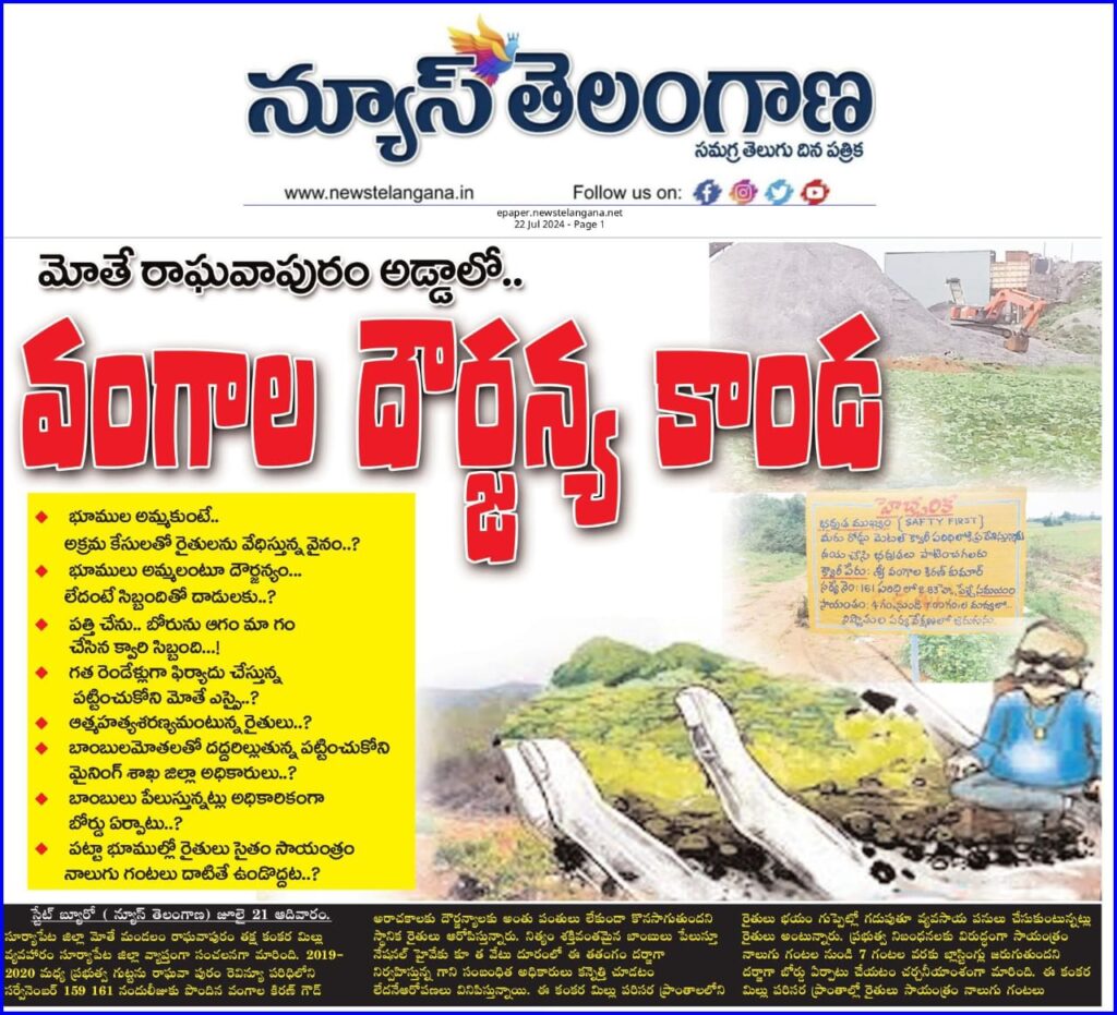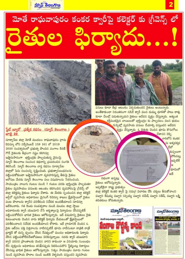 సూర్యాపేట జిల్లా మోతే మండలం నల్ల బండ గుట్ట సమీపంలోని సర్వే నెంబర్ 161 లో తక్ష కంకర మిల్లు వ్యవహారంపై ఆర్డీవో బుధవారం మోతే మండల పరిధిలోని రాఘవాపురంనల్లబండ గుట్ట సమీపంలోని రైతుల పంట పొలాలను ఆర్డీవో పరిశీలించారు. ఈ మేరకు పలువురు రైతులు కంకర మిల్లు యజమాని దౌర్జన్యాలు పంట నష్టం పై ఫిర్యాదు చేశారు. వ్యవసాయ పొలాలలో ఆర్డీవో తో పాటు మోతే తాహసిల్దార్ సంఘమిత్ర సంఘమిత్ర తదితరులు హాజరై పంటలను పరిశీలించారు. ఈ మేరకు రైతుల స్టేట్మెంట్లను రికార్డు చేయాలని ఆర్డీవో ఆదేశించడంతో రైతులు మోతే తహసిల్దార్ కార్యాలయానికి చేరుకున్నారు. అనే సమయానికి మోతే తాహ సిల్దార్ కార్యాలయంలో కంకర మిల్లు యజమాని సిబ్బందితోపాటు ఓ కారులో రుచికరమైన వంటలు భోజన ఏర్పాట్లు చేసి తాహసిల్దార్ తో సంపాదింపులు జరుగుతూ ఉండగా రైతులు స్టేట్మెంట్లు కోసం వచ్చామని తాసిల్దారును కలవగా స్పందించిన తాహ సిల్దార్ సంఘమిత్ర రైతులను ఉద్దేశించి క్వారీ యజమాను నుండి మీకేమి కావాలి? ఏమనుకుంటున్నారు? మీకేం కావాలి చెప్పండి? అంటూ రైతులను గద్దించే ప్రయత్నం చేశారు. తాహసిల్దార్ కార్యాలయ సిబ్బందితో రైతులను ఫోటోలు వీడియోలు తీపించారు. స్టేట్మెంట్ ఇవ్వడానికి వచ్చాం అంటూ రైతులు తెలపగా భూములు ఉన్న వాళ్లు మాత్రమే అది కూడా పాస్ పుస్తకాలు ఉంటేనే స్టేట్మెంట్లు రికార్డు చేయడం జరుగుతుందని తెలిపారు. దీంతో రైతులు గ్రీవెన్స్ లో పదిమంది రైతులు దాకా ఫిర్యాదు చేశామని అందరికీ సమస్య ఉన్నది అందరం స్టేట్మెంట్లు ఇస్తామని భీష్మించి కూర్చున్నారు. దీంతో తహసిల్దార్ రెవిన్యూ ఇన్స్పెక్టర్కు స్టేట్మెంట్లు రికార్డు చేయమని ఆదేశించినట్లే ఆదేశించి తీరా స్టేట్మెంట్ పూర్తయిన తర్వాత ఫిర్యాదుదారుల్లో మొదటి ఉన్న వాళ్లు మాత్రమే ఒక్కరే స్టేట్మెంట్ ఇవ్వాలని మిగతా వారికి సంబంధం లేదని తాహ పలు ఫోన్లో సంభాషణల అనంతరం చెప్పటంతో రైతులు ససేమీరా అని తాహసిల్దార్ తో పలుమార్లు చర్చించినప్పటికీ పాస్ పుస్తకం ఉంటేనే స్టేట్మెంట్ తీసుకుంటామని కరాకండిగా చెప్పటంతో చేసేదేమి లేక రైతులు దిగాలుగా ఇంటి ముఖం పట్టారు. రైతులు స్టేట్మెంట్ ఇచ్చే సమయానికి తాహ సిల్దార్ కార్యాలయం నుండి వెళ్లిపోయారు. కాగా నల్లబండ గుట్ట క్వారీ యజమాని ఎస్సారెస్పీ కాలువ ను సైతం కబ్జా చేసినట్లు సుమారు వంద మీటర్ల దూరంలో 365 నేషనల్ హైవే ఉన్నప్పటికీ ఎటువంటి నిబంధనలు పాటించకుండా దర్జాగా బాంబు బ్లాస్టింగ్లకు పాల్పడుతూ లక్షలాది రూపాయలు నెలనె ల ఆశిస్తున్నట్లు రైతులు ఆరోపిస్తున్నారు. కాగా సుమారు 70 ఎకరాలలో అటవీ ప్రాంతంలో ఈ క్వారీ నిర్వహించడం వలన 1500 మీటర్ల దూరంలో మరో మూడు గ్రామాలు చెరువులు ఉన్నప్పటికీ నిబంధనలను పట్టించుకోకుండా దర్జాగా కంకర వ్యాపా