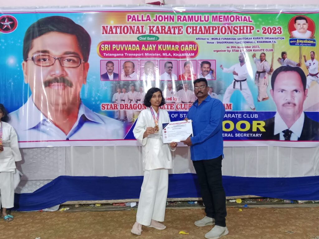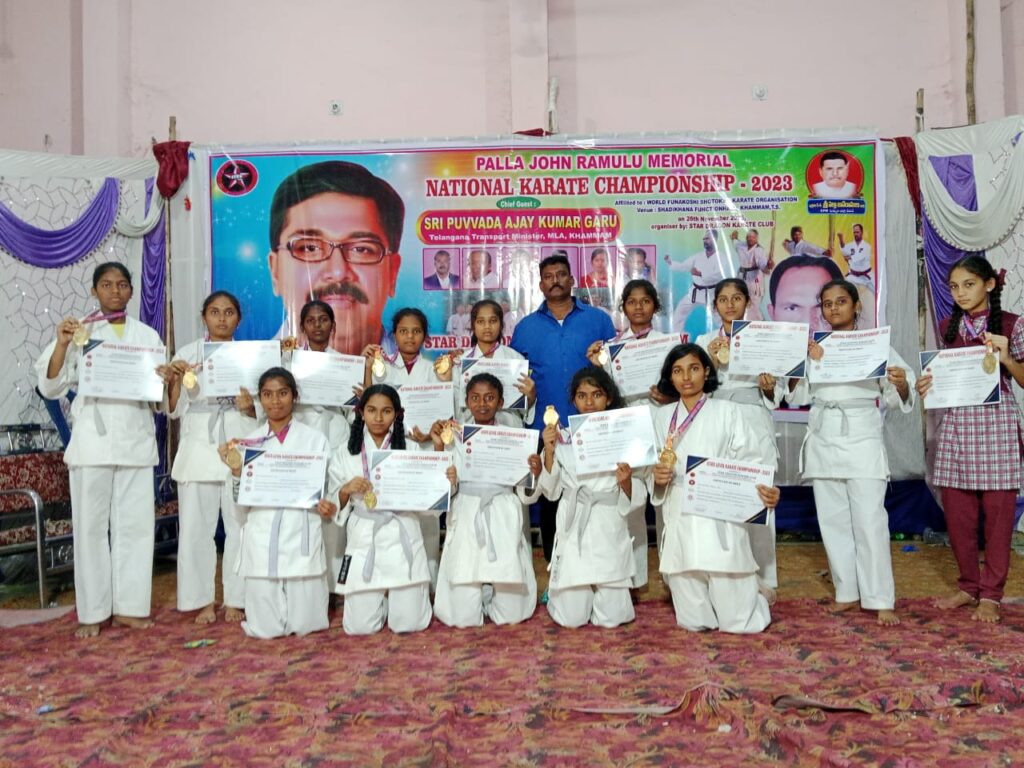 ఖమ్మం టౌన్ : ఖమ్మం నగరం షాధిఖనలో జరుగనున్న పల్లా జాన్ రాములు మెమోరియల్ నేషనల్ కరాటే ఛాంపియన్ షిప్-2023 ను రవాణా శాఖ మంత్రి, ఖమ్మం బి ఆర్ ఎస్ పార్టీ అభ్యర్థి పువ్వాడ అజయ్ కుమార్ లాంఛనంగా ప్రారంభించారు.కరాటే మాస్టర్ ఎం.డి గఫూర్ ఆధ్వర్యంలో చాంపియన్షిప్ లో పాల్గొనే క్రీడాకారులకు పువ్వాడ అభినందనలు తెలిపారు.పల్లా జాన్ రాములు కుమారుడు పీస్ కమిటీ చైర్మన్ పల్లా రాజశేఖర్ అధ్వర్యంలో జరగిన కార్యక్రమంలో నాయకులు అమరగని వెంకన్న, కరాటే మాస్టర్స్, క్రీడాకారుల తల్లిదండ్రులు పాల్గొన్నారు.తదనంతరం జరిగిన కరాటే పోటీల్లో టేకులపల్లి సాంఘిక సంక్షేమ గురుకుల పాఠశాల/కళాశాల విద్యార్థినిలు ఉత్తమ ప్రదర్శన కనబరచి 12గోల్డ్ మెడల్స్ సాధించారు.మెరుగైన ప్రదర్శన చేసిన విద్యార్థినిలు పి.శ్రీవల్లి, వి.హర్షిత, టి.పున్యశ్రి, బి.దెబొర, ఎం.సుప్రియ, కె.సర్ష్మిత, పి.అక్షయ, కె.బిందు, కె.రణశ్రి, బి.దివ్య, వి.వర్షిత,టి.శ్రావణిలను అలాగే కరాటే మాస్టర్ రామకృష్ణను టేకులపల్లి గురుకుల ప్రిన్సిపాల్ మైథిలి, వైస్ ప్రిన్సిపాల్ రమేష్ అభినందించారు.